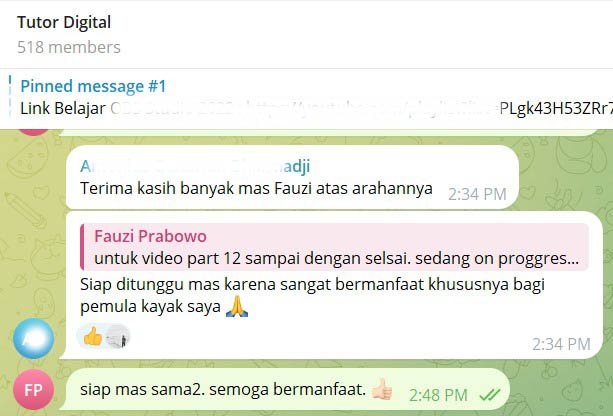 Jangan ragu untuk bertanya ke Saya via tombol chat yang ada di website ini.Ā Dengan senang hati saya akan membantu kamu. Terima kasih, sampai jumpa di kelas. š